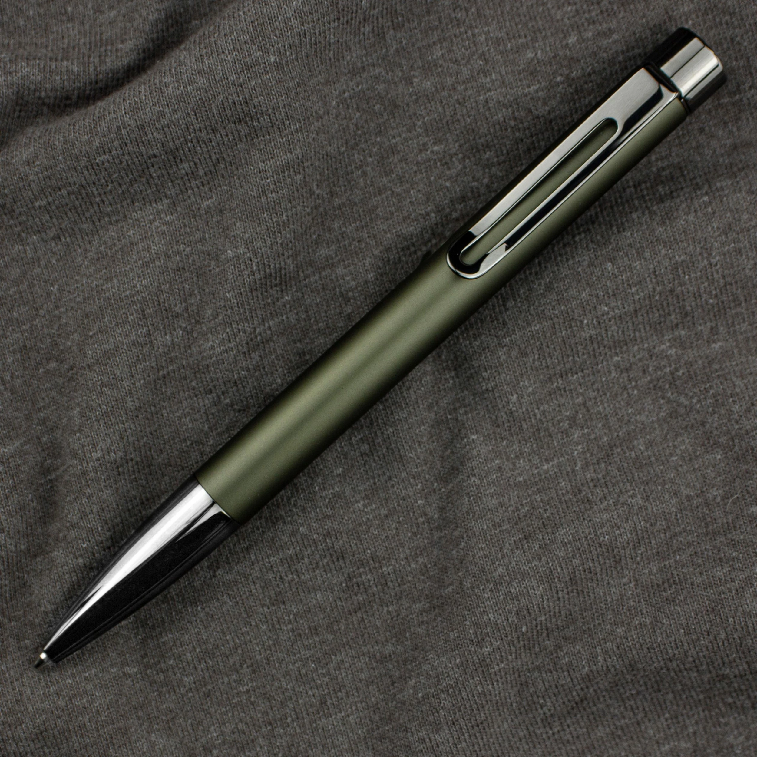 Each aluminum barrel is anodized and treated with a matte finish, resulting in a muted pop of olive green color that is soft to the touch and beautifully accentuated with polished gunmetal accents.